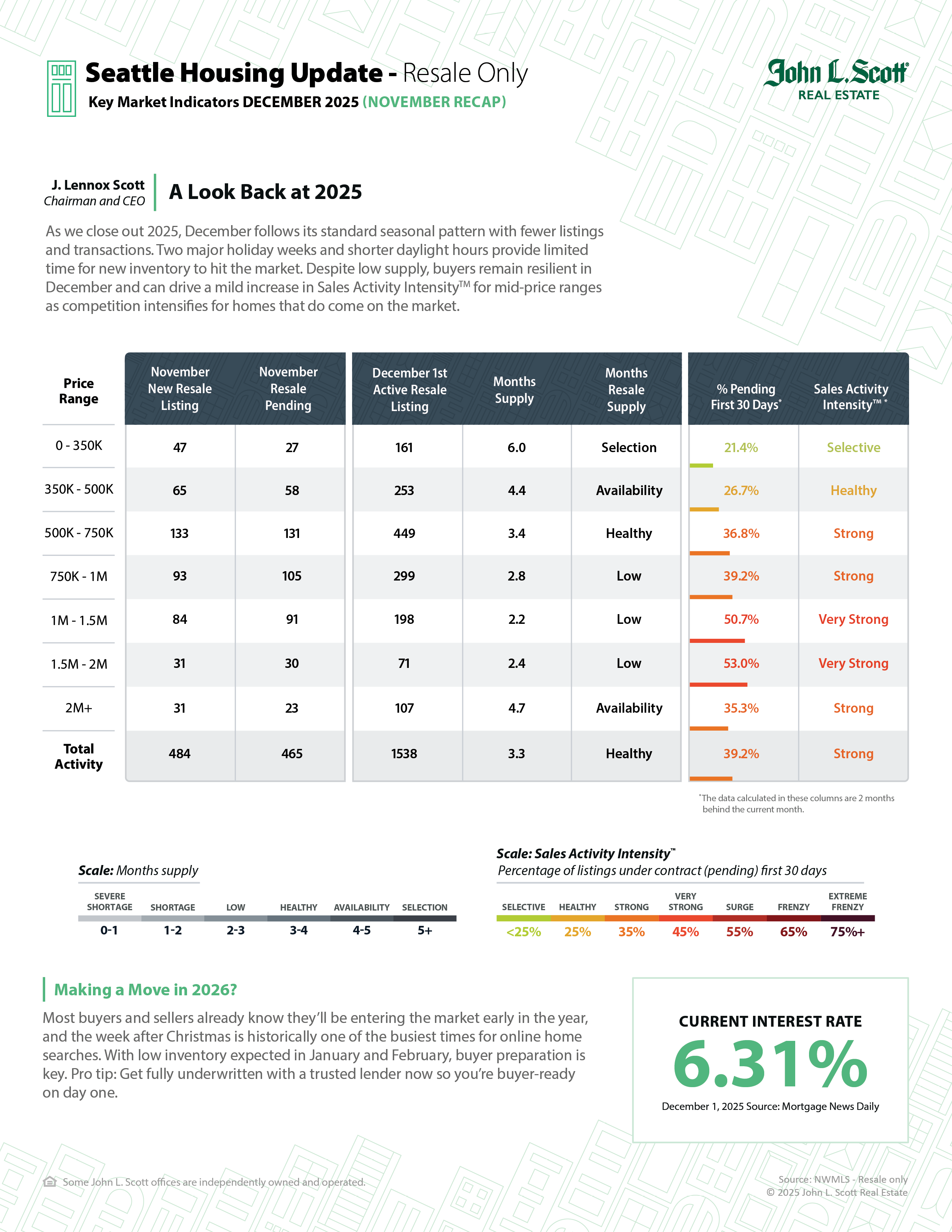 As we close out 2025, December follows its standard seasonal pattern with fewer listings and transactions. Two major holiday weeks and shorter daylight hours provide limited time for new inventory to hit the market. Despite low supply, buyers remain resilient in December and can drive a mild increase in Sales Activity Intensity™ for mid-price ranges as competition intensifies for homes that do come on the market.